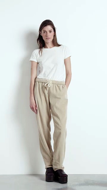 De damesbroek Padow is een belangrijk item in de AMV-garderobe. Deze broek is gemaakt van het iconische, soepele en glanzende corduroy en valt op door zijn soepele pasvorm en retro-look, die nog wordt versterkt door een subtiele vintage-behandeling. De elastische tailleband zorgt voor absoluut comfort, terwijl de carrot-pasvorm een gestructureerd en natuurlijk silhouet creëert. Ideaal in een totale look met het overhemd uit dezelfde familie voor een zelfverzekerde stijl, maar ook perfect te combineren met een oversized trui of een blazer voor een moderne en contrasterende look.