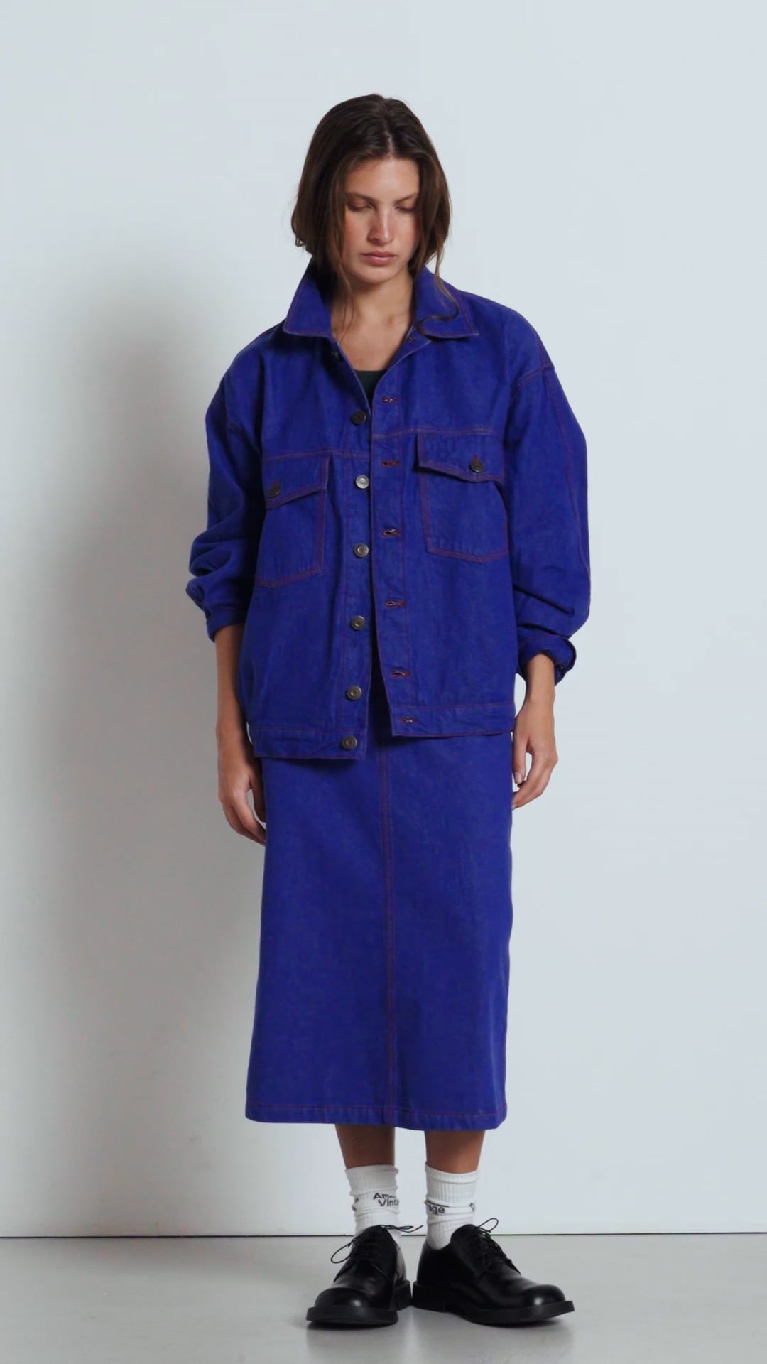 Die Damenjacke Grezbay ist mit ihrem rohen Denim-Material, ihrer Form und ihrer neonblauen Farbe mit kontrastierenden Ziernähten ein Retro-Modell. Die authentische Baumwolle stammt aus biologischem Anbau. Die Jacke kann solo, mit einem Teil aus der Grezbay-Kollektion oder mit einer anderen Jeans für einen Total-Denim-Look getragen werden.