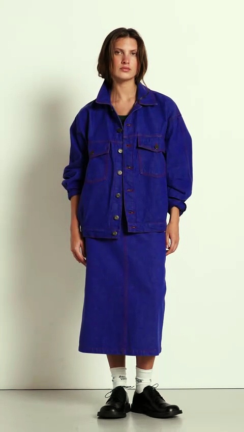 The Grezbay women's jacket is a retro piece with its raw denim fabric, shape and neon blue colour with contrasting topstitching. Its authentic cotton is organically grown. The jacket can be worn on its own, with a piece from the Grezbay line or with another pair of jeans for a total denim look.