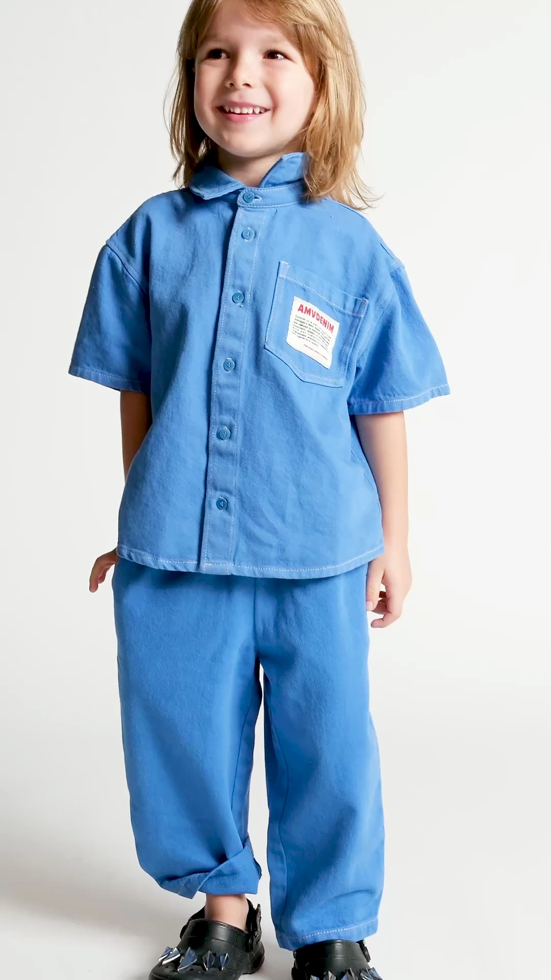 The Pusway short-sleeved shirt for children stands out with its modern silhouette and everyday wearability. Made from textured, structured denim with a bouclé feel, it adds character and texture to the silhouette. Made from cotton containing fibres from organic farming and recycled fibres, it is comfortable to wear. Versatile, it can be worn on its own or layered to create a casual, contemporary look.