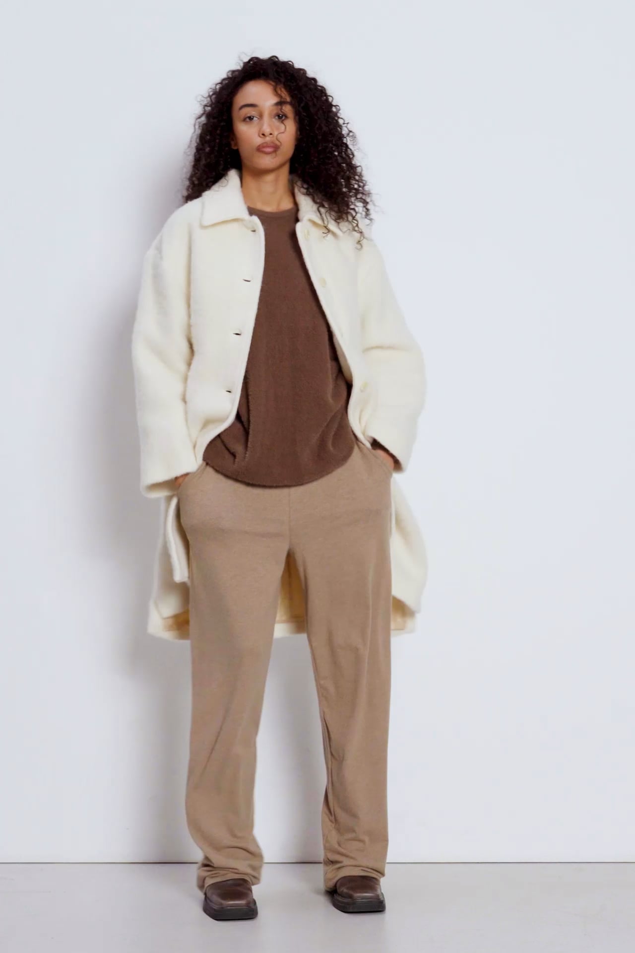 The Lulow women's mid-length coat is made from textured Italian wool blend fabric containing alpaca. Its thick, warm and durable material protects you from the cold in style. Its loose fit allows you to easily wear a jumper, sweatshirt or cardigan underneath while remaining comfortable.
