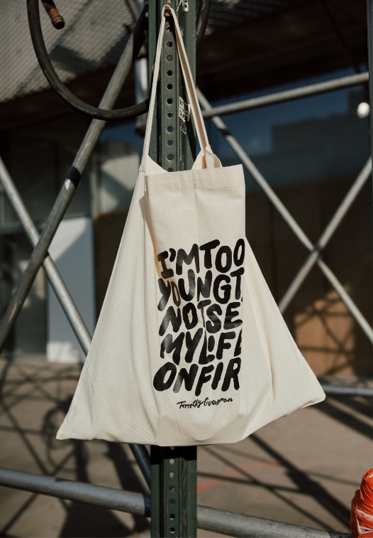 This exclusive print is also on a white American Vintage t-shirt and a cotton tote bag, an alternative version of which will be available printed with the message "I'm too young to not set my life on fire".